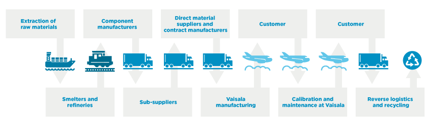 Com o objetivo de comunicar melhor nossas expectativas de sustentabilidade e garantir uma cadeia de suprimentos responsável de materiais que forneçam diretamente para os nossos distribuidores, a Vaisala integrou o gerenciamento sustentável da cadeia de suprimentos em sua estratégia de terceirização. A estratégia enfatiza uma abordagem de longo prazo para melhor identificação e gerenciamento de riscos e oportunidades, alinhando os esforços de sustentabilidade dos nossos parceiros da cadeia de suprimentos aos nossos, e incentivando o desenvolvimento contínuo e uma colaboração mais estreita através de diálogo construtivo. Ferramentas e recursos fazem parte do gerenciamento contínuo da cadeia de suprimentos e os temas ambientais, sociais e de governança são discutidos e monitorados regularmente com os principais fornecedores.