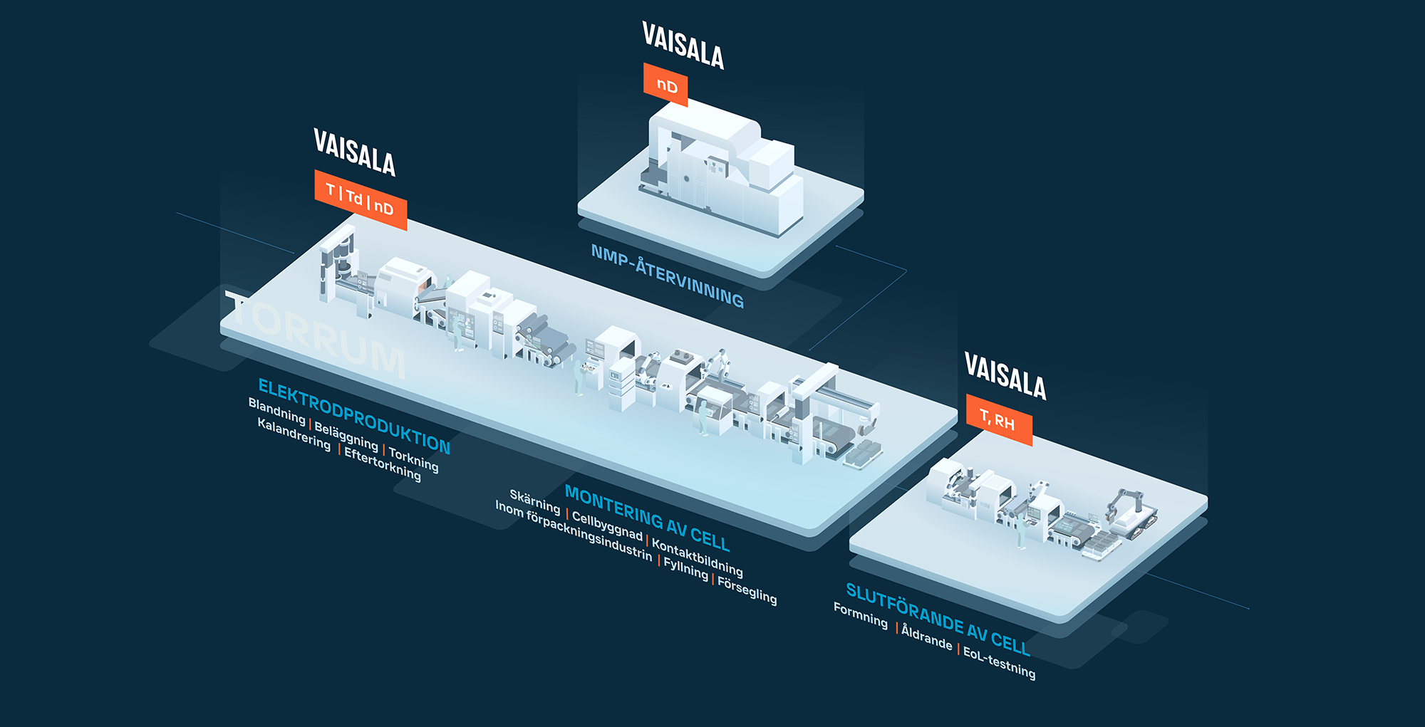 Vaisalas daggpunktsprober är utformade för att optimera avfuktningsenheternas effektivitet under batteritillverkningen, något som avsevärt minskar energiförbrukningen och driftkostnaderna. Vaisalas snabbreagerande daggpunktsprober används för att upprätta en sluten styrslinga med den avancerade torken, i syfte att optimera processen.