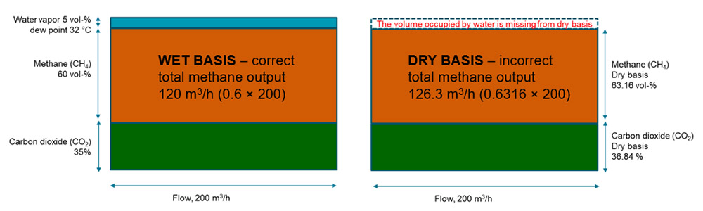 为了达到所要求的效率水平,甲烷测量不会因补偿有误而出错至关重要。通常情况下,沼气厂通过将干甲烷浓度(抽取测量)与湿流量(现场测量)相乘来计算甲烷量,这样计算得出的甲烷量会存在误差,与气体湿度成正比。