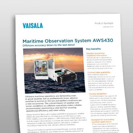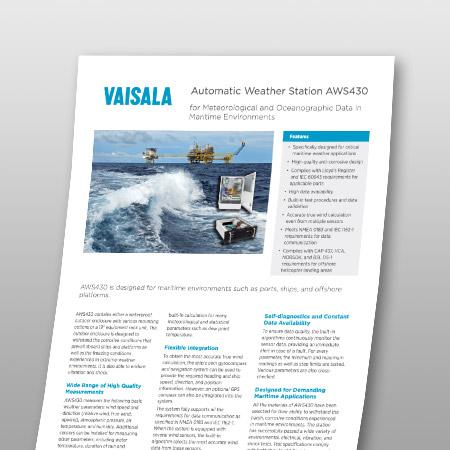海洋观测系统AWS430 设计用于在海上作业条件下提供关键的海上天气和风力观测数据的自动气象站。 安全和高效的海上作业 可操作的信息 持续的数据可用性 灵活的集成 经得起考验的海上应用 安全和高效的海上作业 维萨拉海洋气象观测系统AWS430,专为海上海洋环境的挑战性条件而设计,如船舶、浮式生产储油船船(FPSO)以及海洋和直升机平台。 AWS430提供必要的天气观测数据,以进行安全、高效的海上作业所需的复杂天气和海洋条件的计算。可以获取实时天气测量数据,包括气压、风速和风向、空气温度、露点、相对湿度、水平能见度和船舶姿态。 传感器和系统的设计符合海上日常的应用,能够耐受海洋盐分、水分、苛刻温度、振动和冲击。 可操作的信息 AWS430提供详细、实时的海上运行状况。它利用实时海洋、大气和风暴观测数据,对当前和临近的天气和风况进行多方面、准确的监测。 您可以从值得信赖的传感器中获得所需的信息,从而做出关键决策,保护您的海上人员,同时提高您的生产力。 持续的数据可用性 AWS430系统,提供天气和风的情况,从而助力获取丰富信息作出的海上作业决策。内置算法持续监测传感器数据,并在出现故障时立即发出警报。 对于每个参数的最小和最大值以及步长限制步进值,而且还对各种参数进行交叉校验,以确保所有测量的准确性和完整性。 灵活的集成 AWS430系统的设计符合海上应用的要求。多个连接端口使您能够轻松定制传感器选项,以提供您的海上作业所需的具体观测数据。它也可以集成到船舶的陀螺罗盘和导航系统中,为建模和预测提供航向、航速、方向以及位置信息。也支持NMEA和IEC指定的数据通讯的要求。 经得起考验的海上应用 AWS430系统是适用于为海上作业的苛刻条件的。所有系统和传感器组件都经过设计,能够耐受腐蚀性的海洋条件、振动和冲击,以及船舶和海上平台上普遍存在的恶劣天气环境中的冻融条件。 测试规格符合劳氏船级社和适用部件的IEC国际海事标准的规范要求。 安全和高效的海上作业 安全和高效的海上作业 维萨拉海洋气象观测系统AWS430,专为海上海洋环境的挑战性条件而设计,如船舶、浮式生产储油船船(FPSO)以及海洋和直升机平台。 AWS430提供必要的天气观测数据,以进行安全、高效的海上作业所需的复杂天气和海洋条件的计算。可以获取实时天气测量数据,包括气压、风速和风向、空气温度、露点、相对湿度、水平能见度和船舶姿态。 传感器和系统的设计符合海上日常的应用,能够耐受海洋盐分、水分、苛刻温度、振动和冲击。 可操作的信息 可操作的信息 AWS430提供详细、实时的海上运行状况。它利用实时海洋、大气和风暴观测数据,对当前和临近的天气和风况进行多方面、准确的监测。 您可以从值得信赖的传感器中获得所需的信息,从而做出关键决策,保护您的海上人员,同时提高您的生产力。 持续的数据可用性 持续的数据可用性 AWS430系统,提供天气和风的情况,从而助力获取丰富信息作出的海上作业决策。内置算法持续监测传感器数据,并在出现故障时立即发出警报。 对于每个参数的最小和最大值以及步长限制步进值,而且还对各种参数进行交叉校验,以确保所有测量的准确性和完整性。 灵活的集成 灵活的集成 AWS430系统的设计符合海上应用的要求。多个连接端口使您能够轻松定制传感器选项,以提供您的海上作业所需的具体观测数据。它也可以集成到船舶的陀螺罗盘和导航系统中,为建模和预测提供航向、航速、方向以及位置信息。也支持NMEA和IEC指定的数据通讯的要求。 经得起考验的海上应用 经得起考验的海上应用 AWS430系统是适用于为海上作业的苛刻条件的。所有系统和传感器组件都经过设计,能够耐受腐蚀性的海洋条件、振动和冲击,以及船舶和海上平台上普遍存在的恶劣天气环境中的冻融条件。 测试规格符合劳氏船级社和适用部件的IEC国际海事标准的规范要求。 行业应用 海事 通过海事气象管理解决方案,空气质量、海况和直升机平台监测以及船舶仪表等监测数据,确保陆上和海上的安全和效率。 了解更多 了解海事气象观测系统AWS430 联系我们,了解海事专用自动气象站如何使可靠的环境监测成为确保海上作业效率和船员安全的重要工具。 联系我们 资料 海事自动气象站AWS430 专门为海上气象测量设计的自动气象站 自动气象站AWS430 探索一个专门围绕关键海洋气象应用而设计的系统。