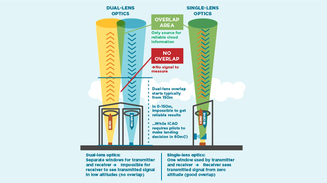 增强型单镜头技术使维萨拉云高仪能够凭借整个测量范围内强大且稳定的信号来提供多个云层的高度准确数据。
