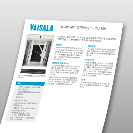 HUMICAP温湿度探头 HMP155 即使在恶劣的环境中也能获得高精度、可靠的温湿度数据。 为精确而设计 稳定性 可靠的测量 可溯源的工厂校准 为精确而设计 维萨拉HUMICAP® 温湿度探头HMP155在包括高湿、沿海和海洋环境等具有挑战性的条件下也能提供准确性和可靠性。 HMP155的设计可实现在湿度接近饱和的高湿度气候下,在温度不断变化的环境中,以及在测量可能被化学品、雾、霭、雨和严重结露影响的恶劣环境中提供精确的数据。 稳定性 HMP155的设计可耐受恶劣的环境。探头结构牢固,使用烧结的特氟龙过滤器作为保护,保护传感器耐受于液态水、灰尘及脏污环境。 可靠的测量 HMP155在剧烈的温度变化下可进行可靠的测量,温度可低至-80°C。加热探头技术即使在冷凝条件下也能提供准确的湿度测量。这也有助于减少化学污染和尽量减少漂移。 可溯源的工厂校准 每台HMP155都是在维萨拉工厂单独调整和校准的。为了确保整个测量范围内的高精度,进行了标准的六点校准,涵盖了从完全干燥到接近饱和条件的湿度范围,并且应用的基准是可追溯的SI。 为精确而设计 为精确而设计 维萨拉HUMICAP® 温湿度探头HMP155在包括高湿、沿海和海洋环境等具有挑战性的条件下也能提供准确性和可靠性。 HMP155的设计可实现在湿度接近饱和的高湿度气候下,在温度不断变化的环境中,以及在测量可能被化学品、雾、霭、雨和严重结露影响的恶劣环境中提供精确的数据。 稳定性 稳定性 HMP155的设计可耐受恶劣的环境。探头结构牢固,使用烧结的特氟龙过滤器作为保护,保护传感器耐受于液态水、灰尘及脏污环境。 可靠的测量 可靠的测量 HMP155在剧烈的温度变化下可进行可靠的测量,温度可低至-80°C。加热探头技术即使在冷凝条件下也能提供准确的湿度测量。这也有助于减少化学污染和尽量减少漂移。 可溯源的工厂校准 可溯源的工厂校准 每台HMP155都是在维萨拉工厂单独调整和校准的。为了确保整个测量范围内的高精度,进行了标准的六点校准,涵盖了从完全干燥到接近饱和条件的湿度范围,并且应用的基准是可追溯的SI。 行业应用 航空 依托成熟的天气和跑道管理解决方案,保障即使在恶劣天气条件下的机场运营也能安全与高效。 了解更多 地面交通气象 通过我们全年的天气和路况监测技术,包括人工智能驱动的数据收集和分析,应对棘手的道路养护挑战。 了解更多 海事 通过成熟的海事气象管理解决方案,空气质量、海况和直升机平台监测以及船舶仪表等监测数据,确保陆上和海上的安全和效率。 了解更多 专业气象 利用准确和可靠的气象观测解决方案,减少日常和极端天气对人们和社区的影响。 了解更多 了解更多HUMICAP温湿度探头HMP155 联系维萨拉,了解准确、可靠的温湿度数据如何改善您的短期和长期预测、天气状况监测和风暴预测。 联系我们