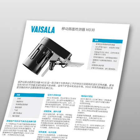 移动路面检测器 MD30 准确采集和传输有关道路和跑道路面状态、湿滑系数和路面温度的数据。 实时条件 适用于除雪车 数据驱动型决策 数据可视化和报告 实时条件 维萨拉移动路面检测器 MD30 可监测道路和跑道状况,并持续传输来自除雪车或其他多种类型车辆的天气数据,从而确保地面运输或机场运营安全顺畅。 MD30 结构紧凑、易于安装,即使在大型车队中进行部署也能实现成本效益。凭借快速响应时间和高灵敏度,该设备全年都可以提供可靠的移动道路和跑道状况数据。 作为维萨拉移动 GRF/TALPA 报告器解决方案的一部分,MD30 根据 ICAO 全球报告格式 (GRF) 评估、整合和报告跑道状况数据。 适用于除雪车 MD30 是为除雪车设计的探测器,它可以作为独立传感器工作,也可以帮助补充固定气象站之间的数据。该探测器的铸造可承受连续振动并防止进水,其设计可确保在恶劣天气条件下都可以获得可靠的路面气象数据。 使用此探测器,市政当局、道路交通管理机构和机场运营商可以轻松获取有关道路路面状态的实时数据,并能直接通过除雪车获取积水深度、冰层厚度、积雪深度、湿滑系数、相对湿度、露点以及道路和空气温度数据。 数据驱动型决策 维萨拉 MD30 改善了冬季道路养护主管和除雪车操作员的信息缺失,为其作出明智决策提供实时数据,包括: 两个气象站之间正在发生什么 怎样才能预测路面状况 使用的材料类型和用量是过多、过少还是正好? 卡车是否正在它们应该前往的地方?是否在率先清理受影响最严重且最重要的路线 除雪车操作员将获得以下相关信息: 黑冰 是否存在眩光、积水或结冰,或者路面是真的潮湿还是只是颜色较深 路面温度什么时候下降,什么时候需要采取措施以防止结冰 应该应用更多还是更少的材料 除雪车驶过后,路上还剩下什么 数据可视化和报告 可供选择的数据可视化利用实时数据和视频图像,使得数据在车辆中查看或远程查看,具体取决于设置选项。MD30 传感器的这一额外优点支持: 冬季道路/跑道的良好处理操作 路面缺陷分析(AI 支持的路面状况清单的一部分) 符合 FAA 和 ICAO 标准的跑道状况报告 实时条件 实时条件 维萨拉移动路面检测器 MD30 可监测道路和跑道状况,并持续传输来自除雪车或其他多种类型车辆的天气数据,从而确保地面运输或机场运营安全顺畅。 MD30 结构紧凑、易于安装,即使在大型车队中进行部署也能实现成本效益。凭借快速响应时间和高灵敏度,该设备全年都可以提供可靠的移动道路和跑道状况数据。 作为维萨拉移动 GRF/TALPA 报告器解决方案的一部分,MD30 根据 ICAO 全球报告格式 (GRF) 评估、整合和报告跑道状况数据。 适用于除雪车 适用于除雪车 MD30 是为除雪车设计的探测器,它可以作为独立传感器工作,也可以帮助补充固定气象站之间的数据。该探测器的铸造可承受连续振动并防止进水,其设计可确保在恶劣天气条件下都可以获得可靠的路面气象数据。 使用此探测器,市政当局、道路交通管理机构和机场运营商可以轻松获取有关道路路面状态的实时数据,并能直接通过除雪车获取积水深度、冰层厚度、积雪深度、湿滑系数、相对湿度、露点以及道路和空气温度数据。 数据驱动型决策 数据驱动型决策 维萨拉 MD30 改善了冬季道路养护主管和除雪车操作员的信息缺失,为其作出明智决策提供实时数据,包括: 两个气象站之间正在发生什么 怎样才能预测路面状况 使用的材料类型和用量是过多、过少还是正好? 卡车是否正在它们应该前往的地方?是否在率先清理受影响最严重且最重要的路线 除雪车操作员将获得以下相关信息: 黑冰 是否存在眩光、积水或结冰,或者路面是真的潮湿还是只是颜色较深 路面温度什么时候下降,什么时候需要采取措施以防止结冰 应该应用更多还是更少的材料 除雪车驶过后,路上还剩下什么 数据可视化和报告 数据可视化和报告 可供选择的数据可视化利用实时数据和视频图像,使得数据在车辆中查看或远程查看,具体取决于设置选项。MD30 传感器的这一额外优点支持: 冬季道路/跑道的良好处理操作 路面缺陷分析(AI 支持的路面状况清单的一部分) 符合 FAA 和 ICAO 标准的跑道状况报告 行业应用 航空 成熟的天气和跑道管理解决方案系列,助力您实现机场的安全高效运营。 了解更多信息 地面交通 应用全年天气和路况监测技术(包括由 AI 提供支持的数据收集和分析)应对艰巨的道路养护挑战。 了解更多信息 想要全面了解道路和跑道状况吗? 我们可以帮助您获取湿滑系数和路面状态、层厚度、路面和空气温度、相对湿度、霜冻等实时数据。 联系我们 产品文档 数据表 手册 Docs.vaisala.com More downloads
