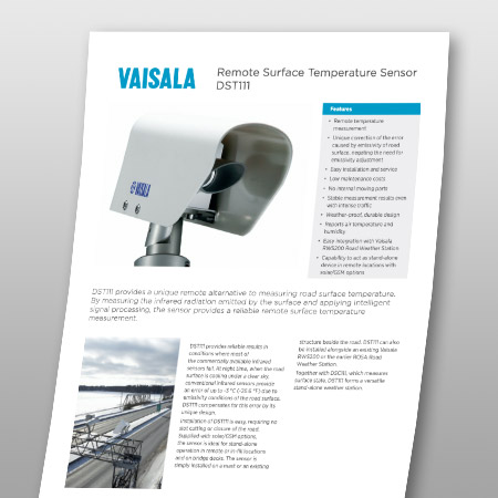 遥感路面温度传感器DST111 遥感的方式准确测量路面温度,无需侵入式安装和维护。 成熟的遥感解决方案 全天候测量 遥感传感器的特点 成熟的遥感解决方案 采用了维萨拉传感器的机构正在受益于维萨拉坚固耐用的非侵入式遥感路况传感器。 DST111遥感路面温度传感器易于安装,避免了传统的成本和复杂性。它能使作业安全顺利地运行,即使在苛刻的条件下也能提供全天候的道路气象信息,并通过准确、可靠的数据为您的决策提供支持。DSC211遥感路面状态传感器和DST111串联起来,可以对天气状况进行整体评估,这些传感器可以很容易地与现有的气象系统(如维萨拉公路气象站)集成。 全天候测量 DST111日夜测量红外辐射量,采用智能信号处理以获得准确的测量精度。 这种传感器为测量道路面温度提供了有效的远程替代方案,可以作为一个独立的设备在偏远地区或现有结构上,或在桥面上使用。这种遥感解决方案除了保护司机外,还能保护相关工作人员。 遥感传感器的特点 用途广泛,具有非侵入性安装 灵敏度高,能够在冰晶导致路变滑之前准确测量冰晶是否存在 易于读取的湿滑系数数据 不会因路面过早损坏、覆盖物、除雪车或积水而损坏 借助于镜片污染指示,优化维护 而且,由于自动校准和高灵活设计,这些传感器几乎不需要维护 成熟的遥感解决方案 成熟的遥感解决方案 采用了维萨拉传感器的机构正在受益于维萨拉坚固耐用的非侵入式遥感路况传感器。 DST111遥感路面温度传感器易于安装,避免了传统的成本和复杂性。它能使作业安全顺利地运行,即使在苛刻的条件下也能提供全天候的道路气象信息,并通过准确、可靠的数据为您的决策提供支持。DSC211遥感路面状态传感器和DST111串联起来,可以对天气状况进行整体评估,这些传感器可以很容易地与现有的气象系统(如维萨拉公路气象站)集成。 全天候测量 全天候测量 DST111日夜测量红外辐射量,采用智能信号处理以获得准确的测量精度。 这种传感器为测量道路面温度提供了有效的远程替代方案,可以作为一个独立的设备在偏远地区或现有结构上,或在桥面上使用。这种遥感解决方案除了保护司机外,还能保护相关工作人员。 遥感传感器的特点 遥感传感器的特点 用途广泛,具有非侵入性安装 灵敏度高,能够在冰晶导致路变滑之前准确测量冰晶是否存在 易于读取的湿滑系数数据 不会因路面过早损坏、覆盖物、除雪车或积水而损坏 借助于镜片污染指示,优化维护 而且,由于自动校准和高灵活设计,这些传感器几乎不需要维护 路面温度测量的挑战? 了解易于安装的遥感解决方案。在准确的路况信息的帮助下,助力您获取更安全和更有效的地面运输之路。 联系我们 行业应用 地面交通 通过我们全年的天气和路况监测技术,包括人工智能驱动的数据收集和分析,应对棘手的道路养护挑战。 了解更多 产品文档 数据表 Docs.vaisala.com More downloads